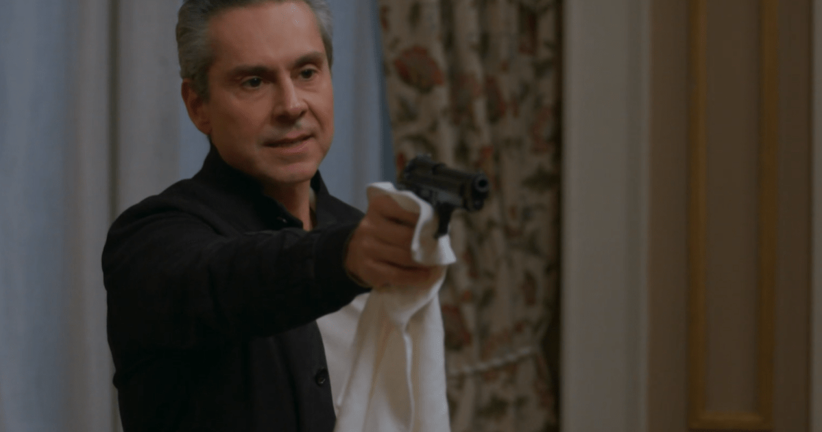 Odete, então, conta que Heleninha tentou atirar na mãe. Em seguida, Marco Aurélio limpa a arma com um pano, segura e atira na mulher.